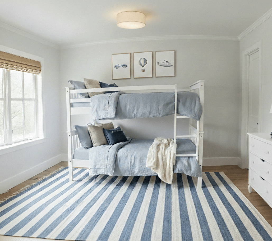 To keep things soft and serene, I opted for this linen shade. Its subtle texture complements the striped rug and bunkbeds without stealing the show.
