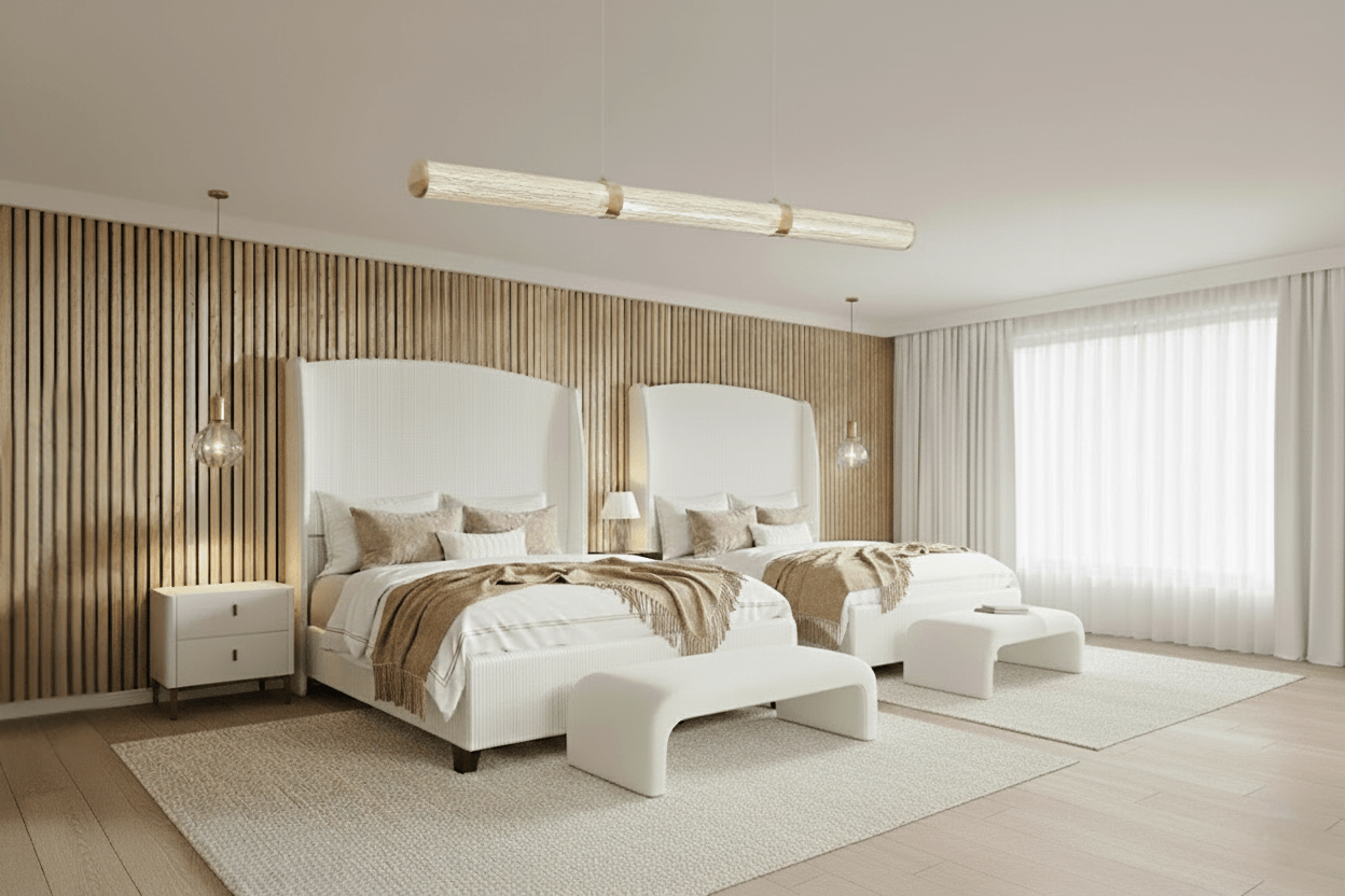 This master bedroom blends soft, neutral elegance with natural warmth. A crisp white leather bed anchors the space, creating a clean, sophisticated focal point, while a wood-paneled accent wall on one side adds depth, texture, and organic charm. The taupe and white palette fosters a serene, calming atmosphere, perfect for rest and relaxation, balancing modern luxury with earthy comfort.