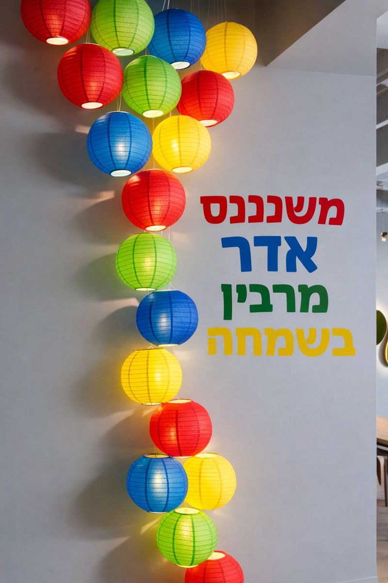Transform your space for Purim with this vibrant, colorful lantern installation. Featuring a modern take on traditional Adar decor, this display brings a warm, festive glow to any room.