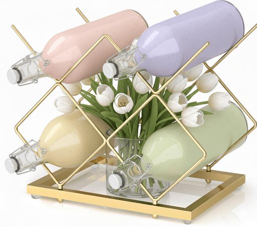 An elegant mishloach manos of soft drinks beautifully arranged in a gold wire rack, accented with fresh tulips for a refined and festive touch