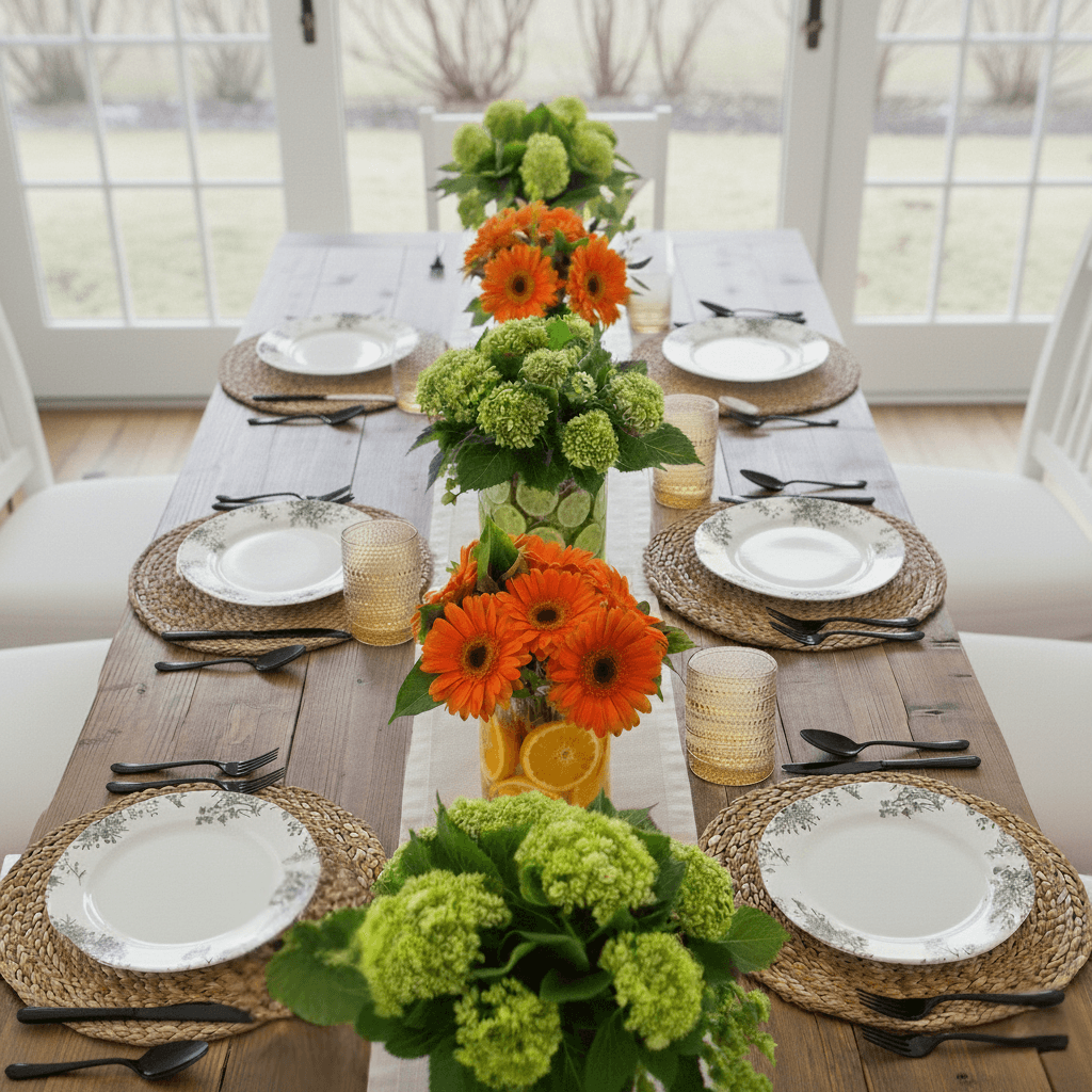 Celebrating Tu Bshvat, I envisioned a tablescape that felt like an indoor orchard, bursting with life! I started with the warm, rustic wood of the table as my base, then layered vibrant oranges and lush greenery to capture the essence of the days promise of new beginnings.